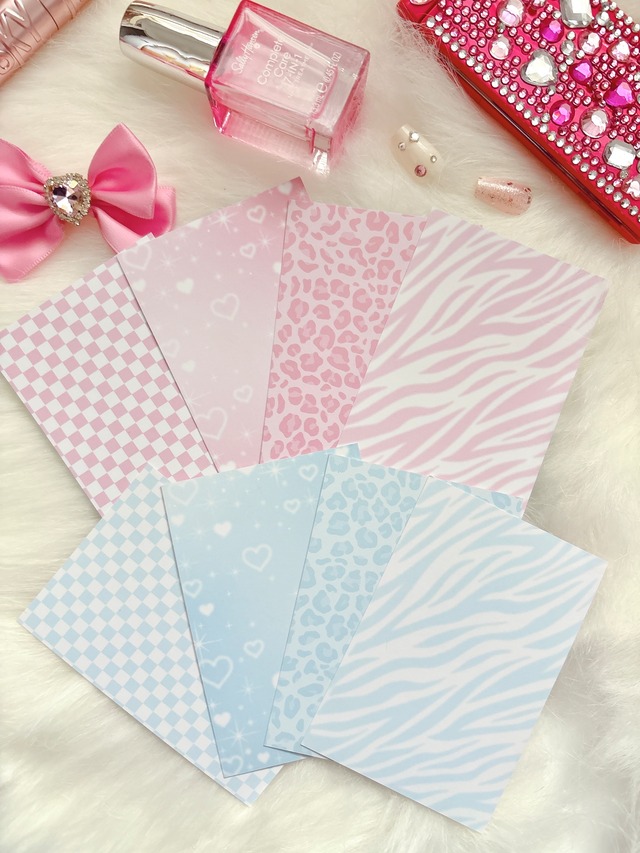 ⋆⸜推し活におすすめ ⸝⋆ 推しのトレカ収納の際に、トレカの後ろにセットして使用するトレカ台紙セットです。 ꙳✧˖°⌖꙳✧˖°⌖꙳✧˖°⌖꙳✧˖°⌖꙳✧˖°⌖꙳✧˖°⌖꙳✧ Love&Joy♡ トレカ台紙セット(20枚入り) ꙳✧˖°⌖꙳✧˖°⌖꙳✧˖°⌖꙳✧˖°⌖꙳✧˖°⌖꙳✧˖°⌖꙳✧ ♡ヒョウ柄(表ピンク、裏ブルー) ♡ゼブラ柄(表ピンク、裏ブルー) ♡ハートグラデーション(表ピンク、裏ブルー) ♡格子柄(表ピンク、裏ブルー) のギャルっぽさ満点の4種類の柄で、それぞれ裏と表でピンクとブルーのカラーとなっています。各カラー16枚ずつのセットとなります。 ◆仕様◆ 内容:各カラー16枚入り サイズ:63mm×93mm 製造:日本 ※商品の性質上、返品・交換は出来かねます。 ※ご使用のモニター環境によって、実際の色と異なる場合があります。
