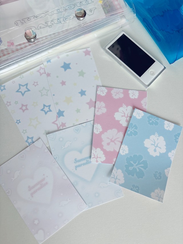 ⋆⸜推し活におすすめ ⸝⋆ 推しのトレカ収納の際に、トレカの後ろにセットして使用するトレカ台紙セットです。 平成ギャルっぽなテイストの夏らしいデザインのトレカ台紙になっています≈≈ ・Colorful Star(星) ・Hibiscus ・Summer Paradise(ハート・いるか) 裏表別々のデザインが印刷されていますので、お好みのほうをご使用ください。 ソンムル用やコラージュなどにもオススメです! ◆仕様◆ size:63mm × 93mm 用紙:マットコート 220kg 内容:各16枚ずつ 製造:日本