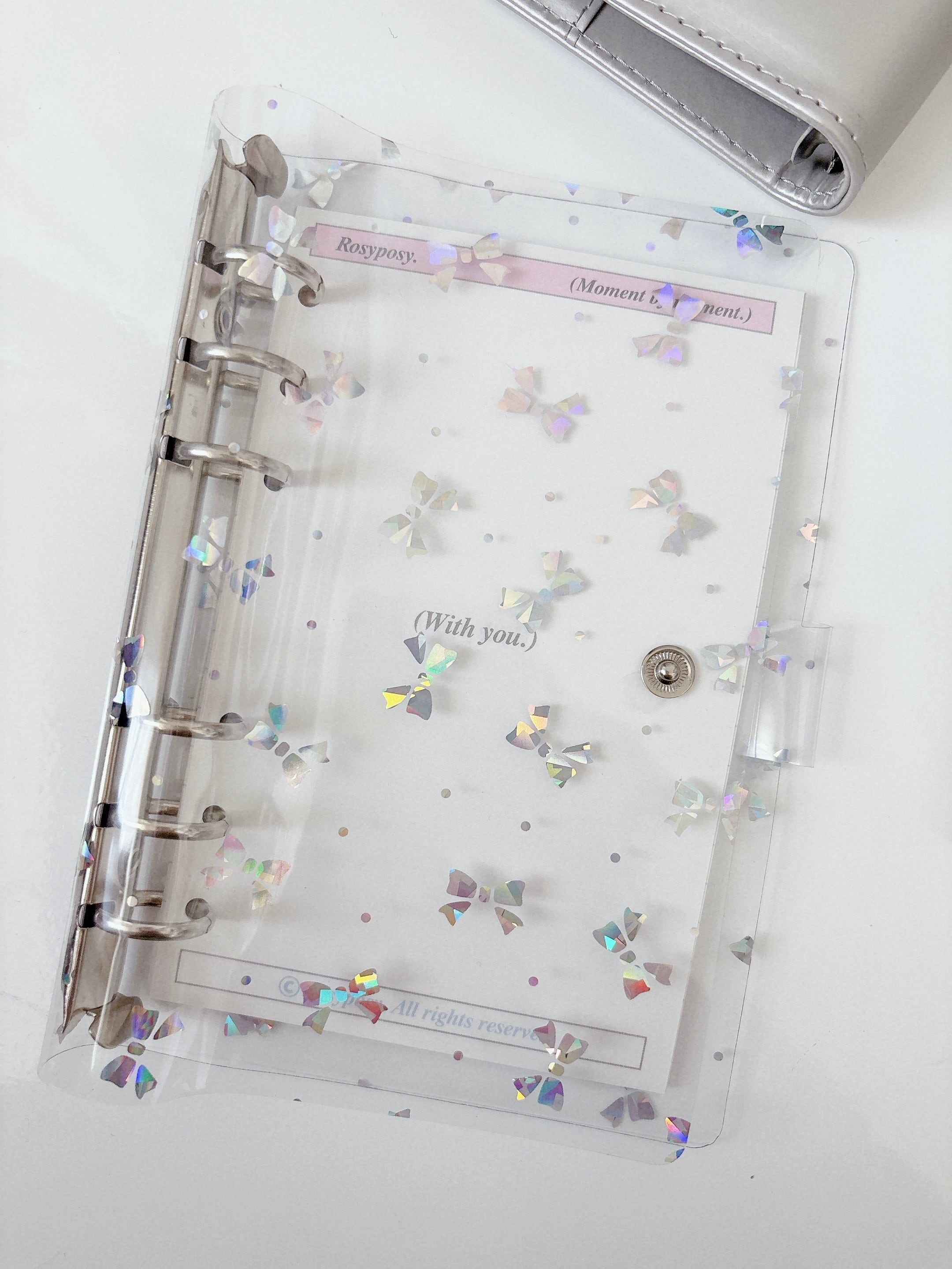 キラキラと輝くリボン柄が散りばめられたA6サイズの6穴バインダー୨ ♡ ୧