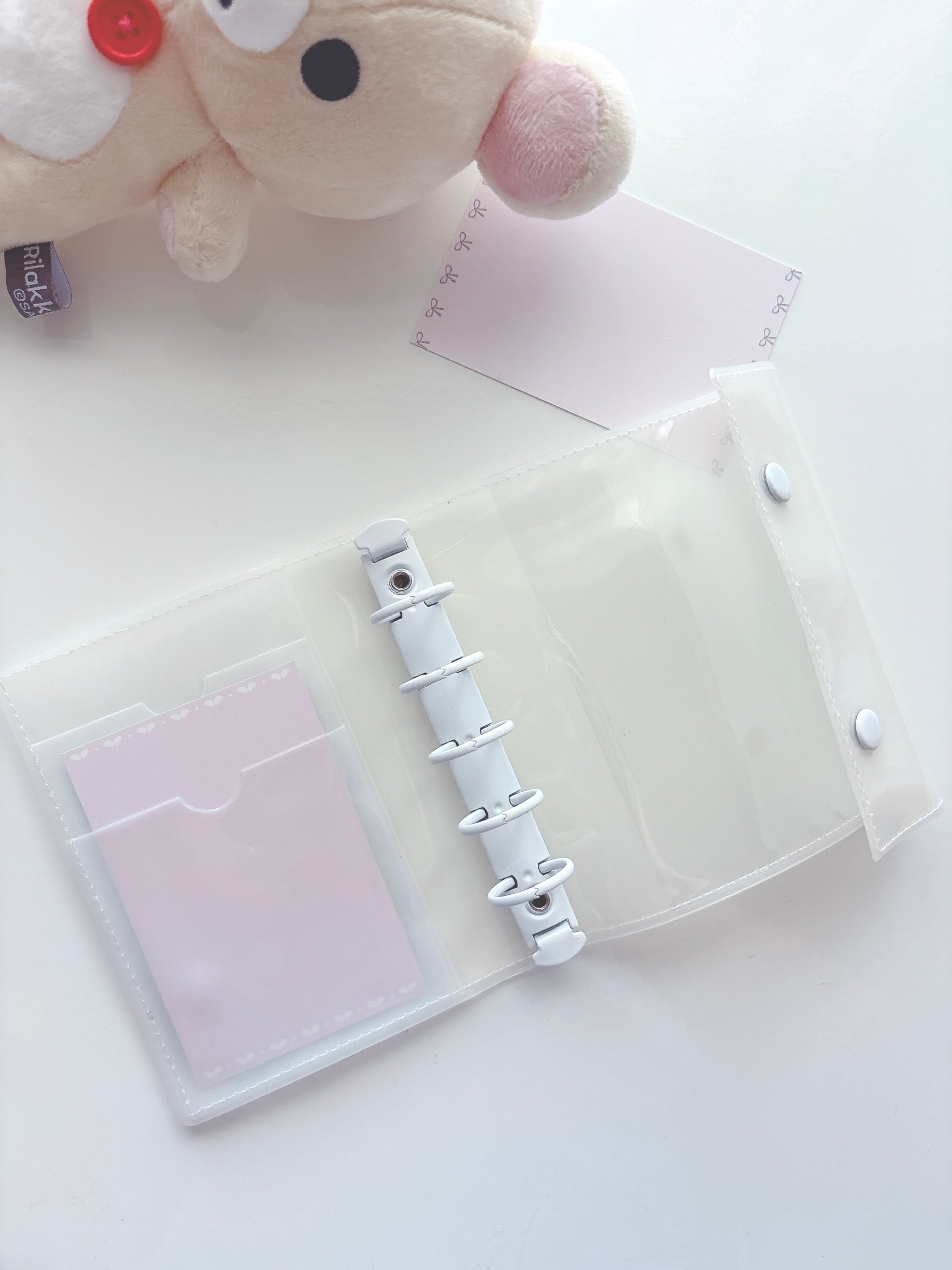 ミルキーなホワイトと、2つのリボンのイラストがさりげない可愛さでワンポイントとなっているM5 バインダーです。