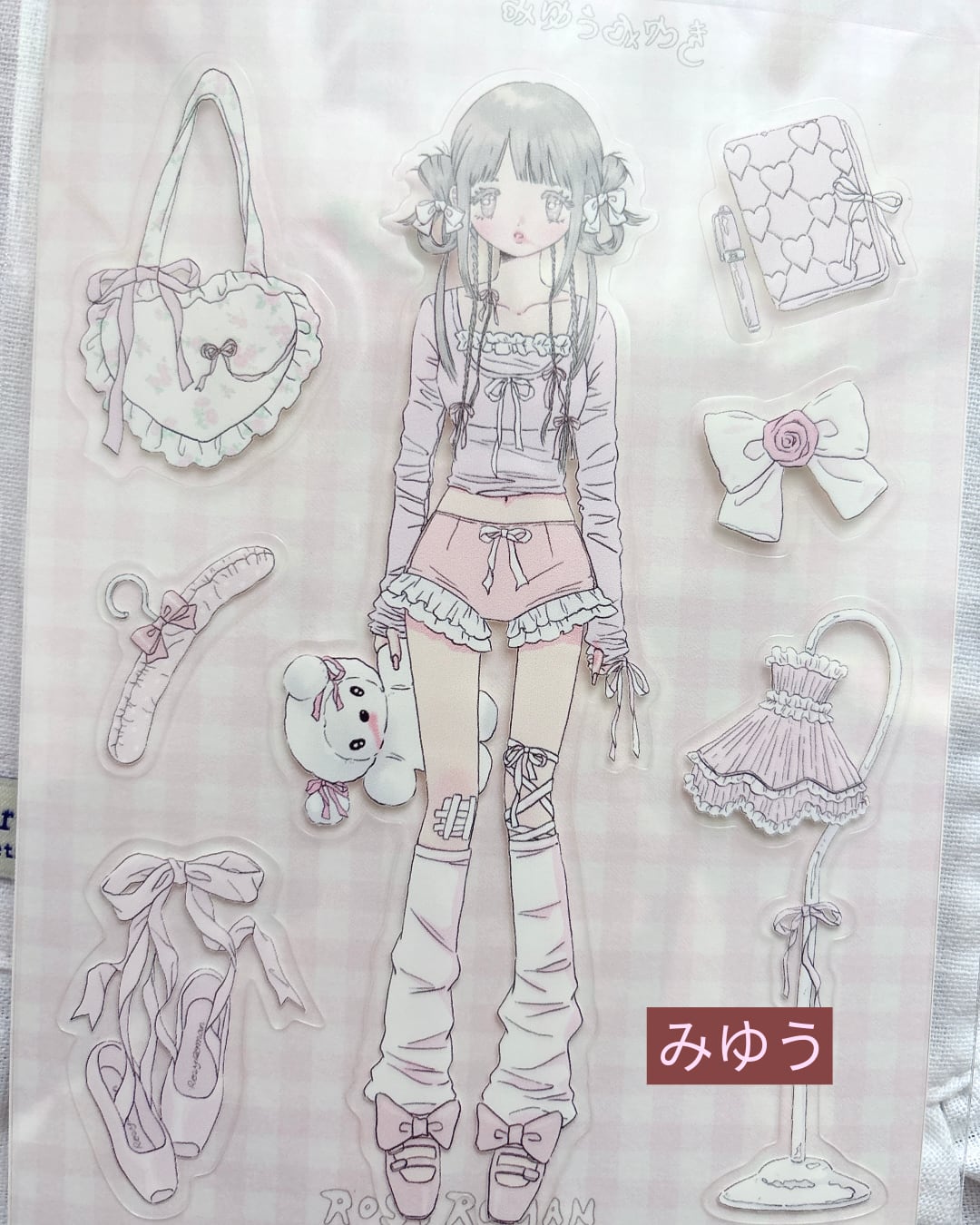 韓国の作家rosemellyclub様の『みゆう』と『みゆき』という2人の女の子の全身のイラストと小物モチーフが詰め込まれたステッカーです。