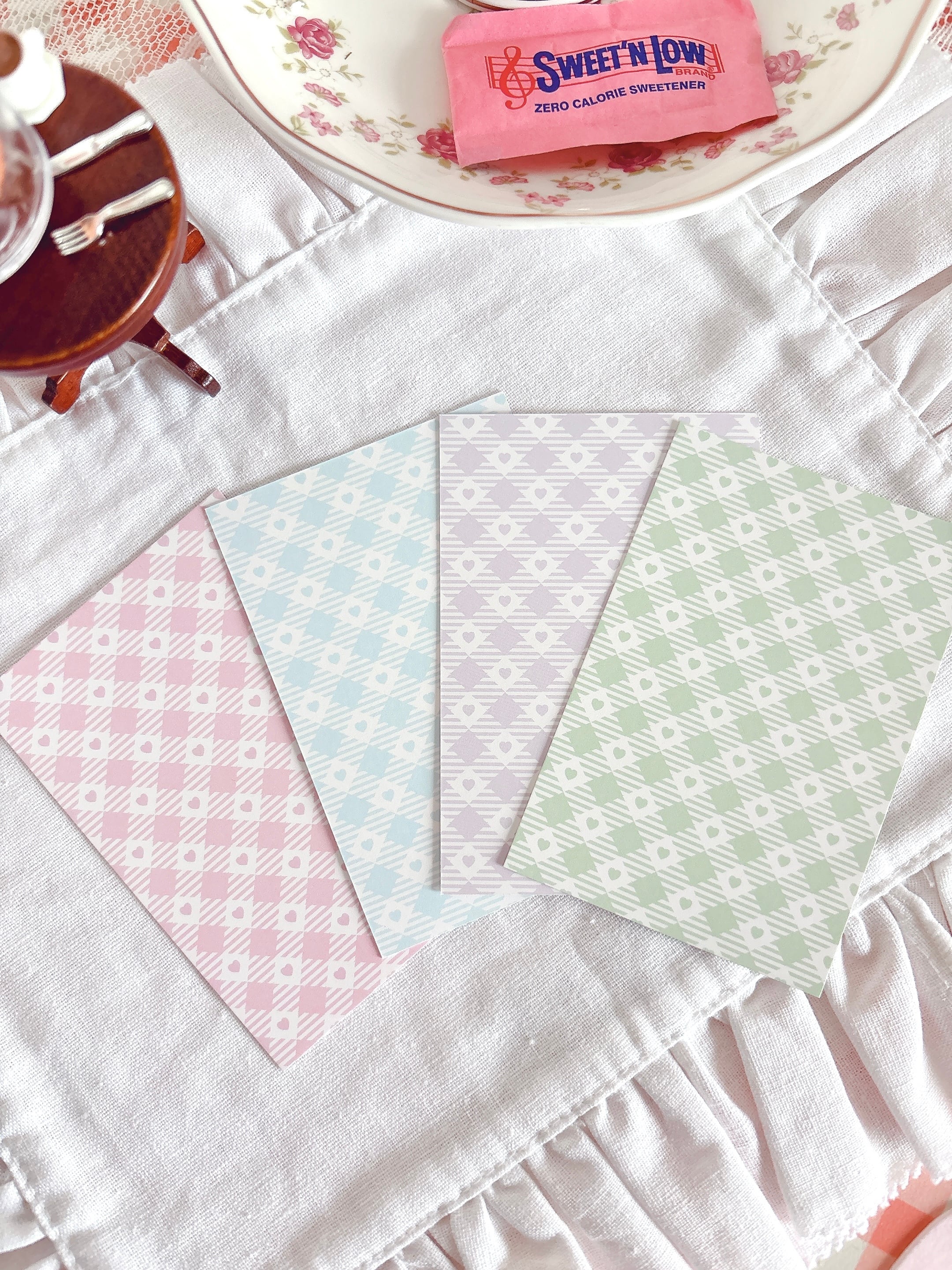 やわらかなパステルカラーのハートチェック柄が可愛らしい『パステルカラーハートチェック台紙』です。