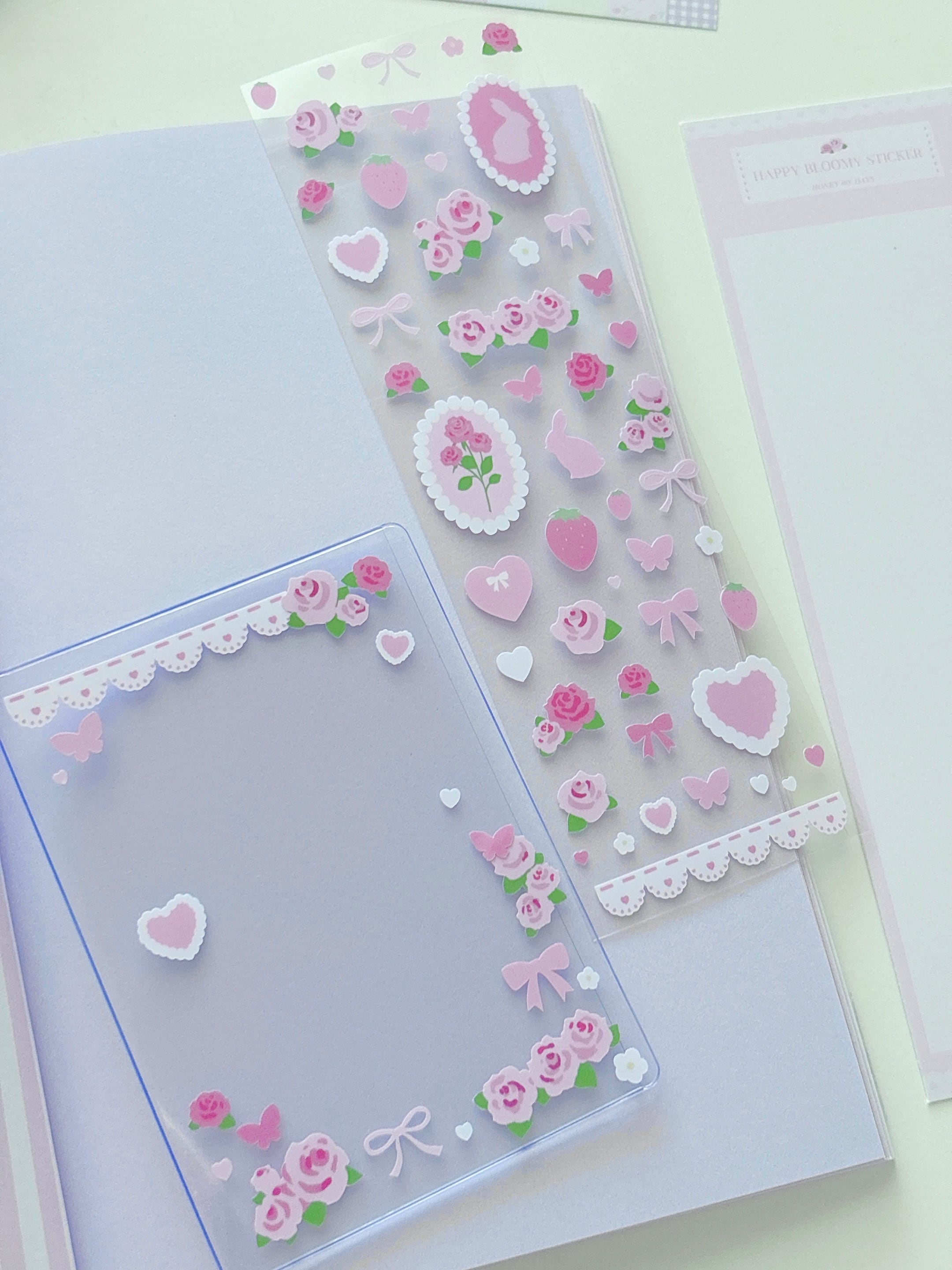 バラやいちご、リボン、ハート、うさぎなど、春のモチーフがたくさん入ったガーリーなステッカーです。