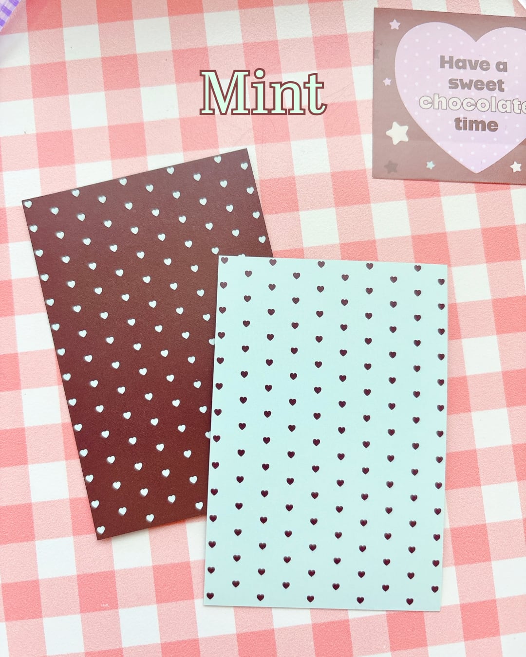 チョコレートブラウン、ピンク、ミント、バターイエローの色の組み合わせが可愛いハート柄のトレカ台紙です。